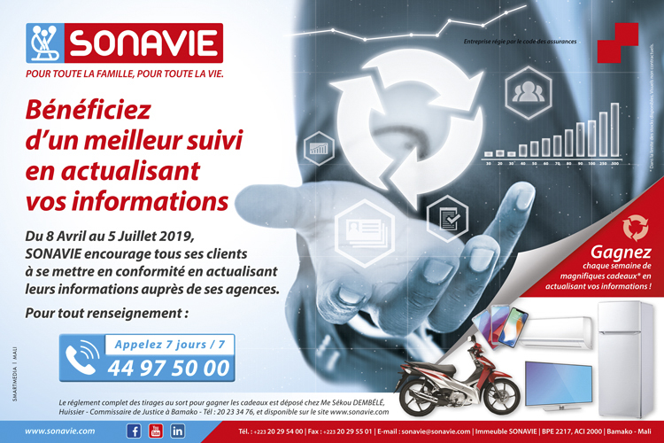 Depuis plus de 20 ans, la SONAVIE poursuit une mission d’utilité publique : permettre aux Maliens de mieux préparer leur retraite, de mieux se protéger et sécuriser leur famille contre les conséquences néfastes d’un arrêt des activités, d’un décès prématuré ou d’une invalidité totale et permanente et de mieux organiser les études de leurs enfants. Aujourd’hui, ce sont des milliers de Maliens, toutes catégories et classes sociales confondues, qui font confiance à la SONAVIE qui, de par sa parfaite intégration à l’environnement économique et social national, joue un rôle majeur d’entreprise citoyenne. Pionnière de l’assurance-vie au Mali, la SONAVIE est le partenaire privilégié pour toute la famille, pour toute la vie.